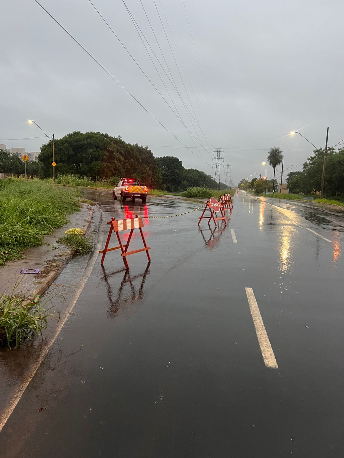 Na avenida Adelmo Perdizza, o ponto de alagamento afetou os dois sentidos no cruzamento com a alça de acesso ao Anel Viário Sul, exigindo controle de tráfego até a normalização.