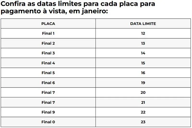 Segundo o decreto estadual, quem optar pelo pagamento à vista em janeiro terá 3% de desconto, desde que quite o débito até o dia correspondente ao final da placa do veículo. Alternativamente, o contribuinte pode pagar em fevereiro sem desconto, seguindo a data-limite vinculada ao número da placa.